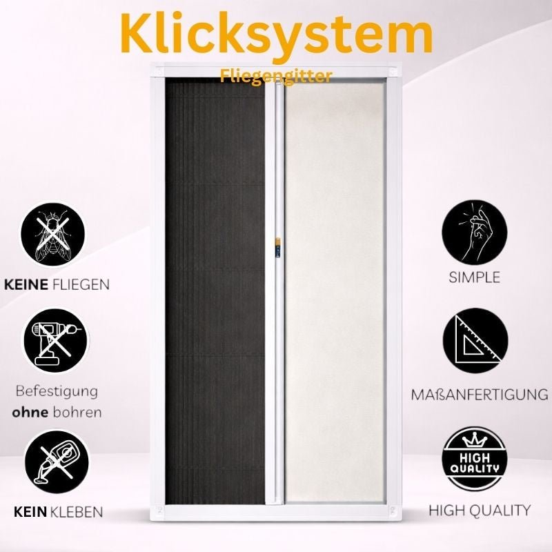 Bei Bestellungen von Klicksystem-Fliegengittern für Türen muss beachtet werden, dass außen am Fensterrahmen kein Türgriff vorhanden ist. Zudem erhält das Klicksystem unten eine Stufe von ca. 2,6 cm. Dies kann dazu führen, dass beim Rein- und Rausgehen dagegen gestoßen wird, wodurch das Fliegengitter herausfallen kann.